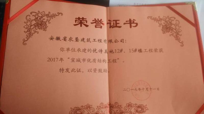 近日,安徽垦建公司承建的优诗美地项目12#15#楼盘被评为2017宣城市优质结构工程