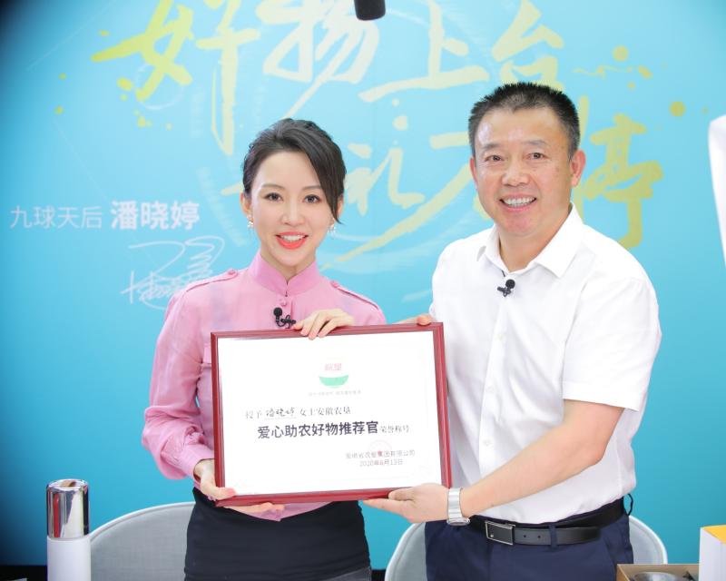 6月13日,“九球天后”潘晓婷在抖音平台进行了个人直播首秀,农垦集团公司副总经理董建平做客直播间介绍安徽农垦集团和皖垦品牌情况,向潘晓婷女士赠送了敬亭绿雪茶叶,并向其颁发了“爱心助农好物推荐官”证书。集团公司战略发展部负责人在直播间同潘晓婷女士一同向广大网友粉丝推介皖垦优质农产品。