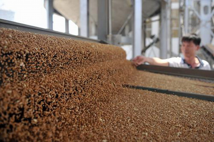 在龙亢农场良种生产厂,工作人员对送来的麦子进行质量检测。