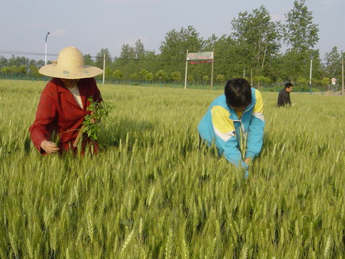 为了使全场1.6万余亩小麦全部达到种子收获质量标准,确保今年麦种的数量和质量,大圹圩农场把大田作为种子生产加工的第一车间,严格制定田间去杂保纯标准,严把种子源头质量关。5月8日,农场组织人员巡回各单位田间地头进行了一次全面大检查,重点查看麦田去杂情况,对存的不足之处和薄弱环节及时提出了整改意见。自5月10日开始,场种子生产部门已组织技术人员对全场各户麦田进行逐田块检查验收,符合田检标准的发给“田检”合格证书,并作为各户麦收时产品按种子粮收购的凭证。对初次田检不合格的,要进行再次清选,直至“田检”过关。图为:5月12日下午,几名职工正在种子田里拔杂草、除异株。