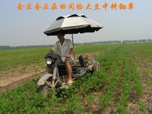 7月30日上午,在明光市潘村湖农场五分场一块大田里,一辆撑着遮阳伞的小型三轮车正在豆行间不紧不慢地行驶着。原来,这是该场职工余正奎正在给大豆中耕锄草。