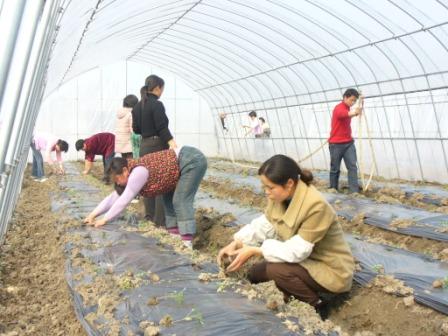 国家现代农业标准化示范场——龙亢农场今年年初投资20万元,新建薄膜温室10亩,从事绿色无公害特菜的试验、示范与推广。该温室工程是该场建设现代农业示范园的重要工程之一,部分温室将作为该场农科所引种特色蔬菜与瓜果品种的试验区、示范区、推广基地;另一部分低价位出租给职工,让他们种植特色水果和蔬菜,由农科所技术人员给予指导和帮助,以此带动更多的职工加入现代农业示范园建设的行列,推动园区发展。 日前该工程已全部投入使用,精心挑选的圣女系列樱桃番茄、名特西瓜等5个新、特、优品种以入棚定植。图为职工正在按标准化要求定植。