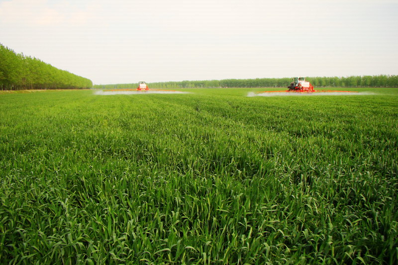 当前正值夹沟农场小麦病虫害防治的关键期,万亩良田里,以往的小机械分散植保作业风景不再,代之以崭新的高地隙高压机动喷雾机,喷洒出匀畅的雾条,既高端又高效。